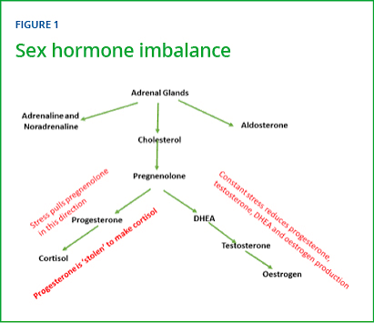 Het stresshormoon cortisol concurreert met progesteron, omdat ze uit dezelfde voorloperstof worden geproduceerd (pregnenolone steal).